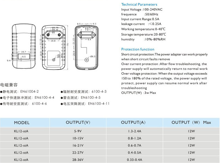 頻率:50/60Hz 輸入電流:0.5A 漏電電流:≤0.25A 工作溫度:0-40℃ 貯藏溫度:-20-80℃ 濕度:10%-80%RH 短路保護(hù): 電源適配器在短路解除時(shí)能正常工作恢復(fù) 過(guò)流保護(hù):過(guò)流故障排除后,電源將自動(dòng)恢復(fù)正常工作 過(guò)壓保護(hù):當(dāng)輸出電壓超過(guò)額定電壓的150-180%時(shí),電源將保護(hù),故障排除后電源能恢復(fù)正常工作" />